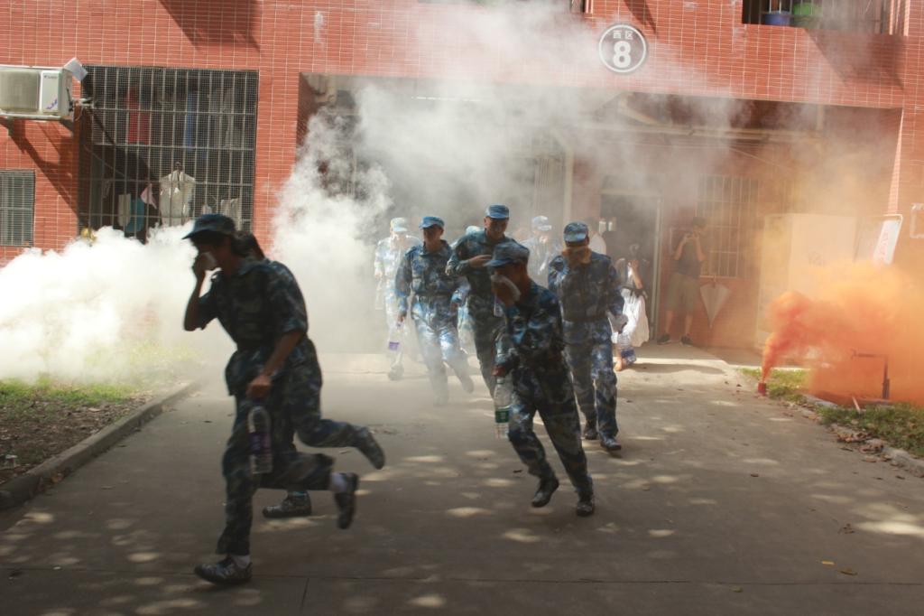 19日下午14:30,随着一阵急促的警报声在学生宿舍西8栋响起,“消防知识进军训”正式开始。顿时,浓烟弥漫!参加演习的学生听到警报声后,在军训教官、宿管员的指引下快速疏散,“不要惊慌,迅速有序下楼”!“注意脚下”,声声警示想起,学生们用湿毛巾捂住口鼻、弯着腰、弓着步沿着安全通道快速有序地撤离到宿舍楼下。