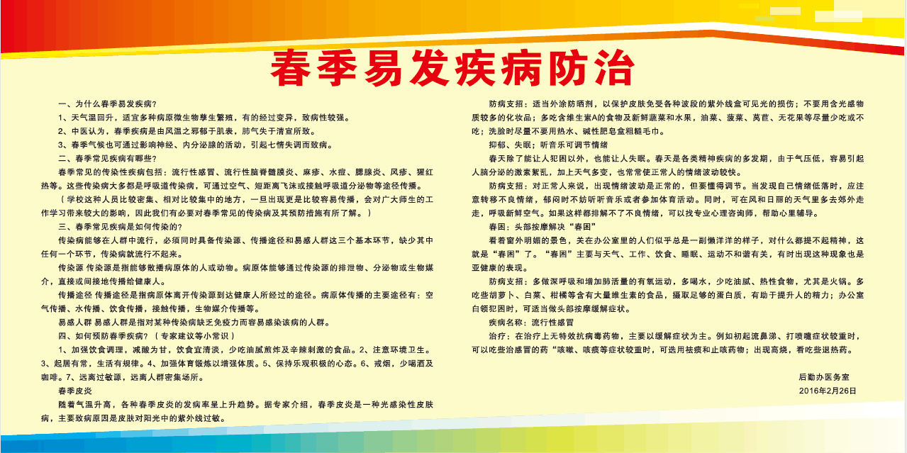 学院学生人数多,流动性大,分布面积广。春季是传染性疾病高发期,做好流行性疾病预防宣传工作显得尤为重要。为此,要求医务室尽快出一期春季传染病预防宣传海报。