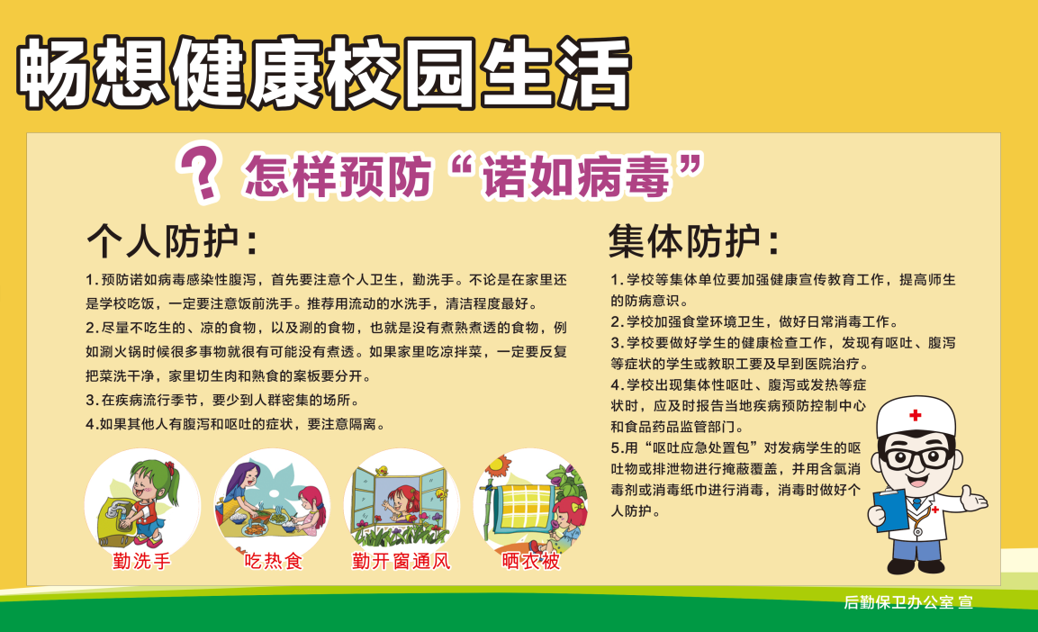 注意:不要到不具备合格卫生条件的餐馆就餐,同学们一旦出现感染发烧,呕吐,腹泻等症状,请及时到医院就诊,并自觉约束自己的行动,不要去人员密集的地方,及聚餐。