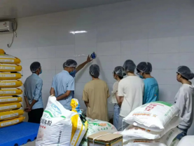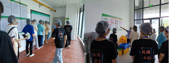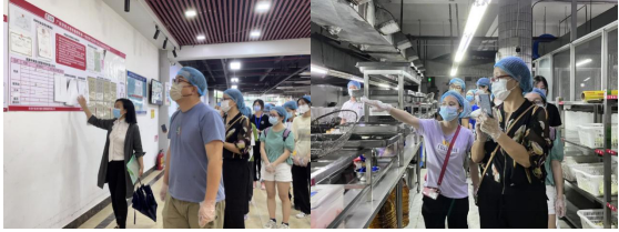 随后,后勤保卫办公室郑翠仪老师带领参加代表进入后厨参观。在参观过程中,郑老师详细介绍了食堂后厨的餐具洗消间、主食加工间、原料仓库、毛菜间、烹饪间等后厨生产加工场所及食品卫生情况,原料严格按照离地、上架、分类、装筐、存柜、进箱、入盒等进行存放。