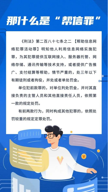 “帮信罪”即帮助信息网络犯罪活动罪,是《刑法修正案(九)》新增设的罪名。简单来说,就是在明知他人利用信息网络实施犯罪(电信诈骗)还为其提供帮助的犯罪。