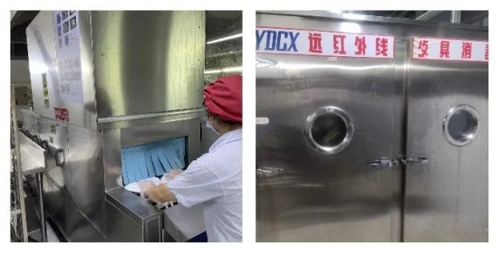 在餐具洗消间,检查组看到洗碗机正在工作中,数名工作人员依次把已冲洗的餐具放进洗碗机,再次清洗消毒。检查组看到这些清洗消毒过程,表示放心。