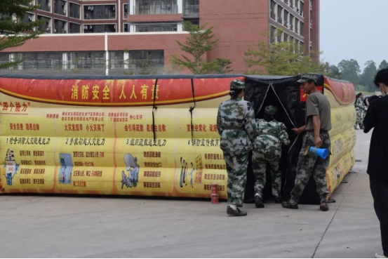 演练结束后,消防员为学生详细地讲解安全逃生屋的构造与逃生注意事项,学生代表们依次有序地体验穿越安全逃生屋,让同学们零距离体验火场的真实情况。在漆黑的帐篷里,同学们通过自主探索逃生路线,成功逃离“火场”。